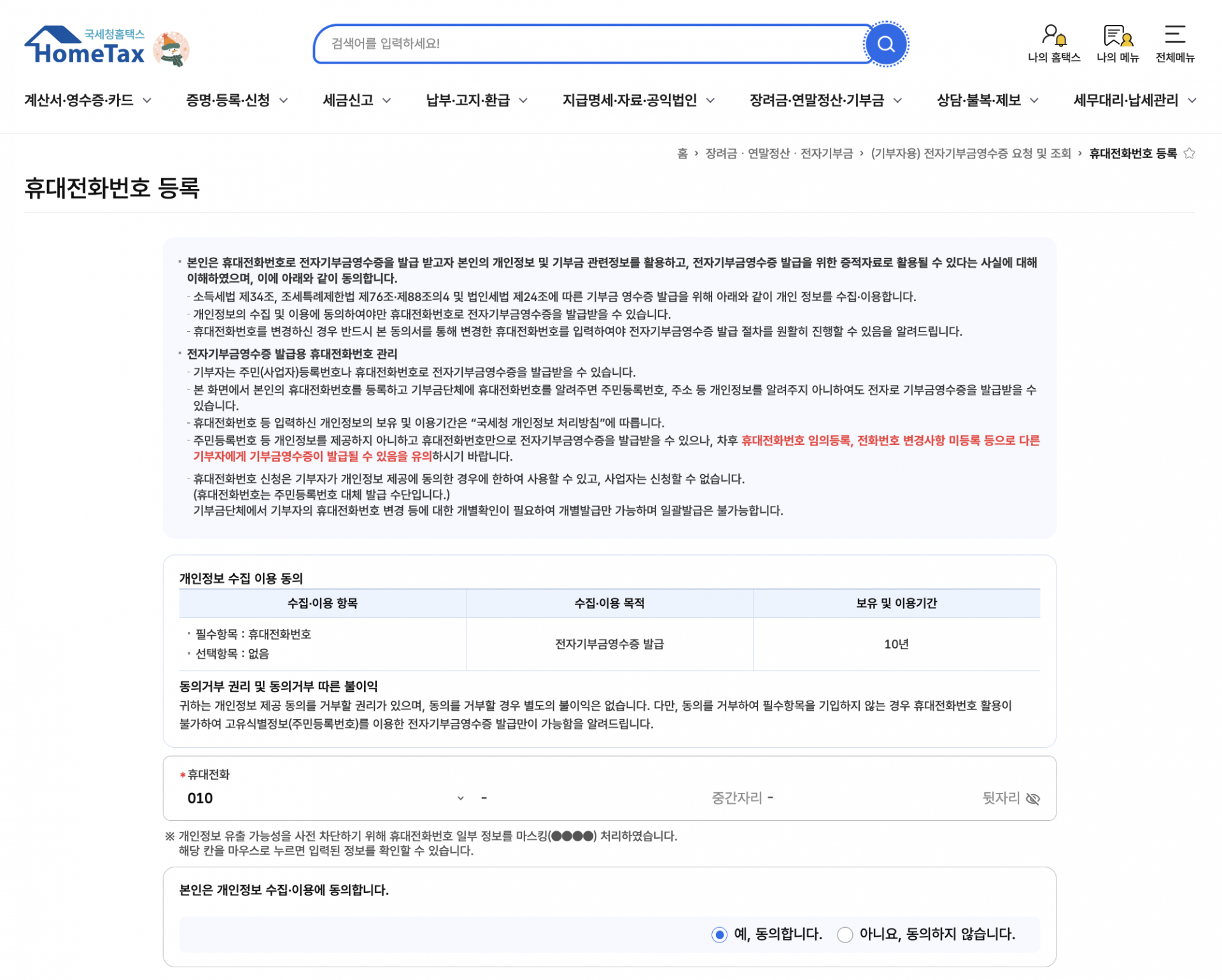 방법: 홈택스 접속 → 메인 검색창에 '휴대전화번호 등록' 검색 → 기부자 본인의 번호 등록 완료