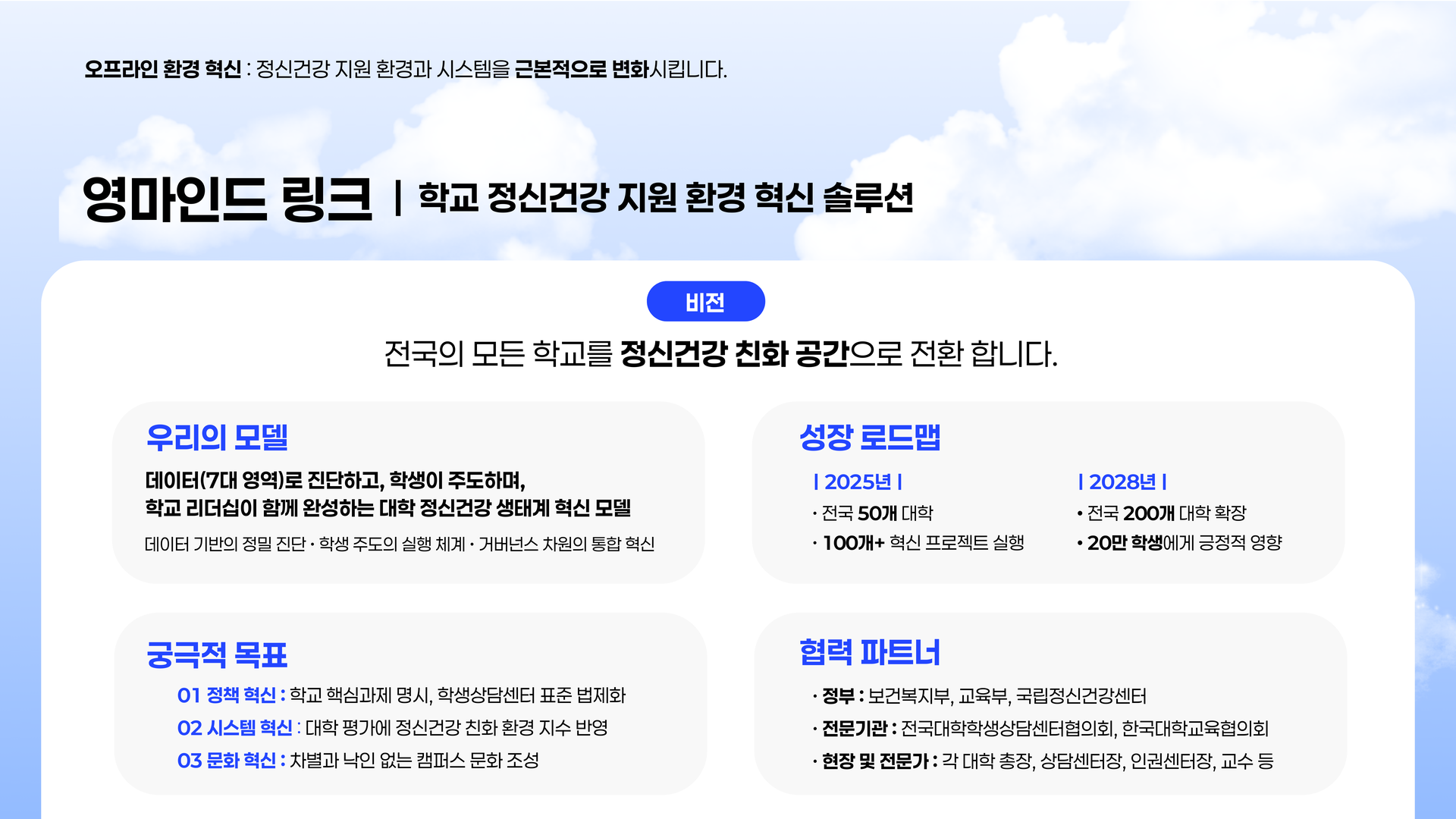 멘탈헬스코리아는 젊은 세대들이 살아가는 학교, 기업, 온라인 환경 자체가 '정신건강 친화적'으로 변화해야 한다는 확고한 철학을 가지고 있습니다.