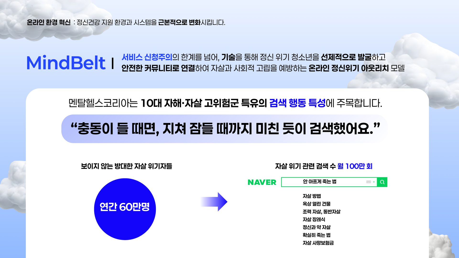 우리는 이러한 사각지대를 해소하고 잠재적 위험에 능동적으로 대응하는 온라인 지원 체계를 구축하여, 디지털 공간에서도 누구도 고립되지 않는 혁신적인 지지 문화를 선도합니다.